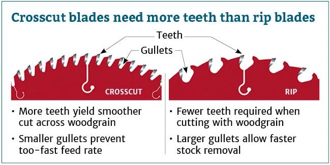 In general, blades with more teeth yield a smoother cut, and blades with fewer teeth remove material faster. A 10'' blade designed for ripping lumber, for example, usually has as few as 24 teeth and is designed to quickly remove material along the length of the grain. A rip blade isn't designed to yield a mirror-smooth cut, but a good rip blade will move through hardwood with little effort and leave a clean cut with minimal scoring.