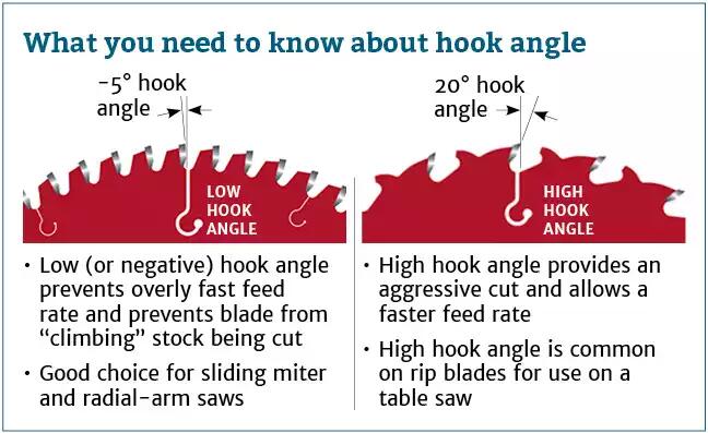 Hook angle has an important effect on blade operation. A blade with high positive hook angle (say, 20°) will yield a very aggressive cut and a fast feed rate. A low or negative hook angle will slow the feed rate and will also inhibit the blade's tendency to "climb" the material being cut. A blade for ripping lumber on a table saw will generally have a high hook angle, where an aggressive, fast cut is usually what you want. Radial-arm saws and sliding compound miter saws, on the other hand, require a blade with a very low or negative hook angle to inhibit overly fast feed rate, binding and the blade's tendency to "climb" the material.
