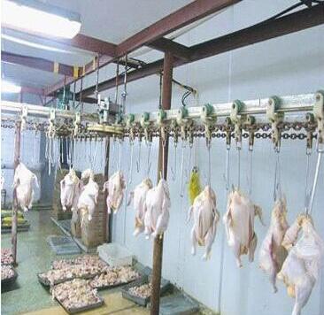 After lifted by the foot-harnessing chain, the pigs will be killed and let blood,then transported to the scalder to be scaled out and then to the shaver for shaving.