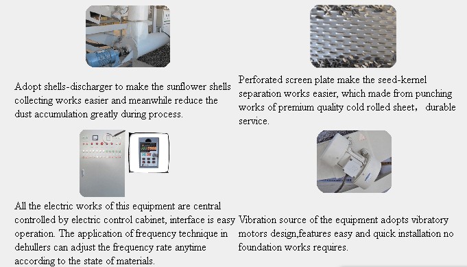 The whole equipment can pre-clean, dehull, remove sunflower shells,separate and reseparate your product at one time, it's the optimum equipment for your sunflower kernels processing industry. It features high persentage of dehulling rate, low persentage of brokens, high automation degree and easy maintenance.