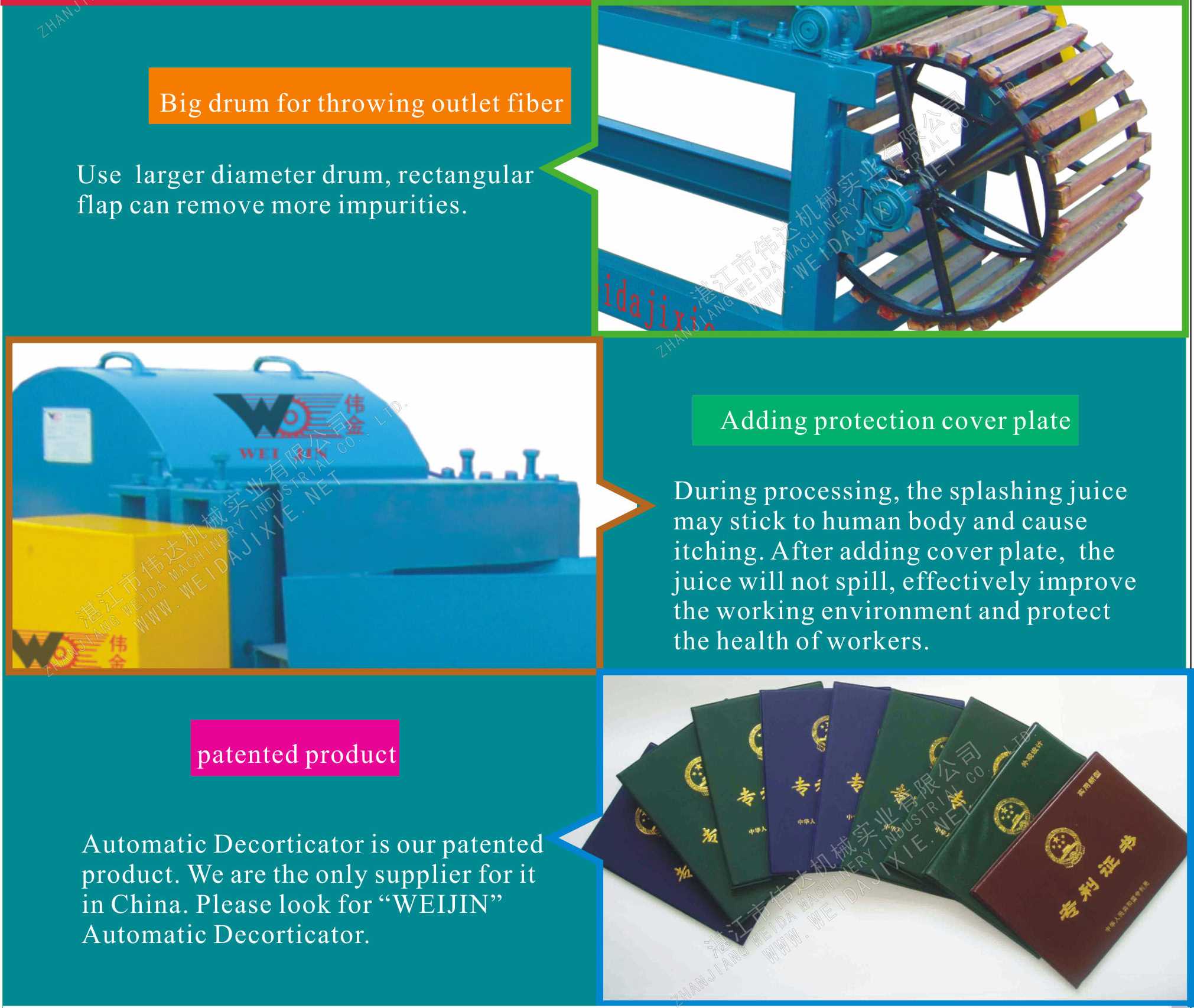 This automatic decorticator is suitable for different raw material such as sisal, jute, banana stem, pineapple leaf, hemp, ramie and so on.
