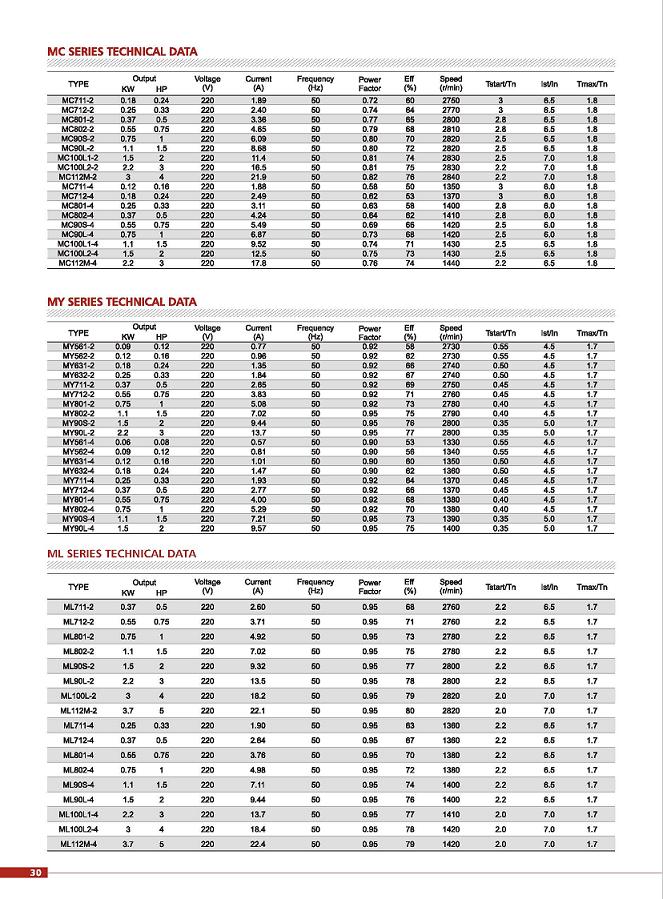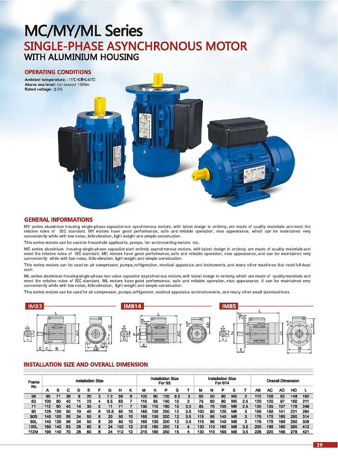 MY series aluminium housing single-phase capacitor-run synchronous motors, with latest design in entirety, are made of quality materials and meet the relative rules of IEC standard. MY motors have good performance, safe and reliable operation, nice appearance, which can be maintained very conveniently while with low noise, little vibration, light weight and simple construction.