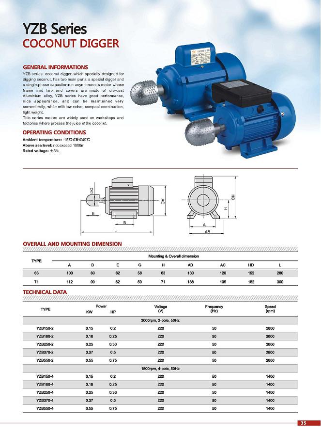 YZB series coconut digger, which specially designed for digging coconut, has two main parts: a special digger and a single-phase capacitor-run asynchronous motor whose frame and two end covers are made of die-cast Aluminium alloy, YZB series have good performance, nice appearance, and can be maintained very conveniently, while with low noise, compact construction, light weight.