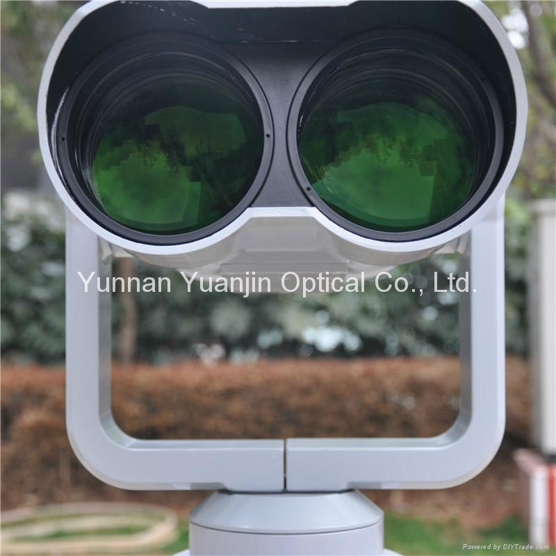 High Power Stationary Telescopes 25x100 coin operated telescope is available in coin and non-coin operated models. The telescopes are designed specially for outdoor installation and long distance viewing. As a result, they can be operated even in adverse weather conditions. Major adopted standards during the process of design and manufacture include GB/T17117 Prism Binoculars, GB1185 Surface Imperfections of Optical Elements, GJB1240 General Specification for Telescope, GJB150 Laboratory Environmental Test Methods for Military Material, MIL-STD-810 Environmental Engineering Considerations and Laboratory Tests, etc. Meanwhile, an optical shutter system is built into the coin operated model of the series. The coin operated system is connected to this shutter system, in which the shutter will be released and hence the patron can observe through the telescope for a timed period when an acceptable coin is deposited into the coin chute. What’s more, the coin operated system is characterized by its low power consumption, electronic intelligence and long service life. The coin chute of the system can be customized to detect and accept different coins and the shutter cannot be released if an unacceptable coin is dropped into the chute. The unacceptable coin will then be ejected automatically. The circuit of the system will automatically go into hibernation when it is idle for some time and the patron needs to drop a first coin (which will be ejected) to awaken the circuit when a beep sound will be heard. Then the shutter system can be operated again by depositing coin(s) and shutter duration will be accumulated in accordance with the number of accepted coins.