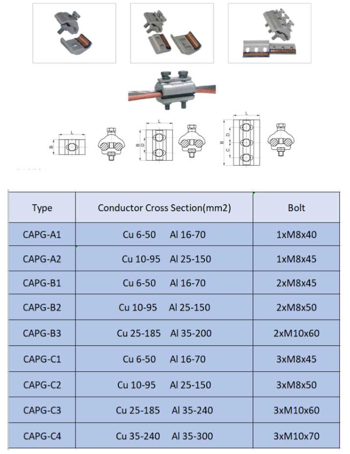 CAPG bi-metallic Parallel Groove Clamps ( bimetallic Parallel Groove Clamps) are used for the connecting and branching of aerial and other aluminium and copper conductors in applications where no mechanical load is existent.