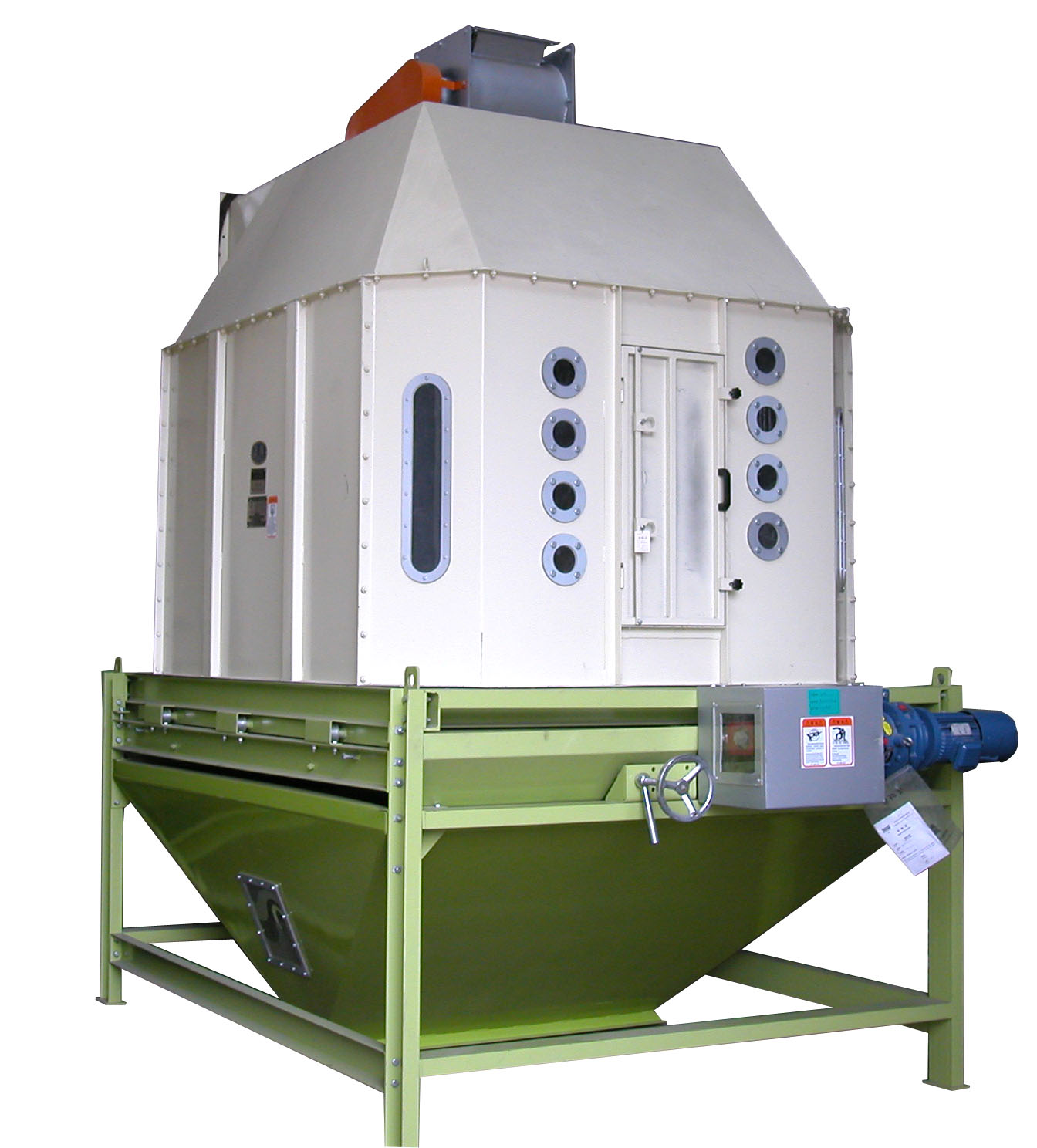 After pelletizing process, the temperature of wood pellets is between 60-80 degrees and the moisture content is close to 15%. So a cooler must be used to reduce their surface temperature and the moisture content which makes the wood pellets easy to store, meanwhile helps screen good and pure pellets.