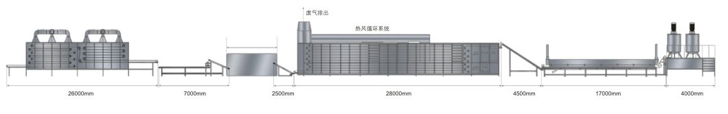 Rice Noodle is produced through this production line with belt spreading using sweet potato starch, mung bean starch and potato starch as raw material. Production procedure from material (starch) water mixing→ belt spreading→ paste forming→ pre-dry→ cooking→ noodle chop→ weight(man work)→ dry and molding→ cooling→ packing to finished products are all in one line. Main products produced by this production line include un-fried instant noodle series and healthy food series which are very popular in the market.