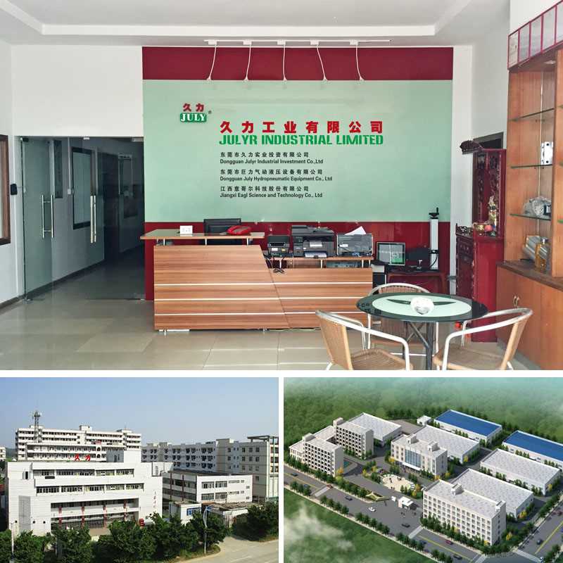 JulyR Industrial Limited, its predecessor called Changhua Machinery Factory, was founded in Taiwan in 1985, then moved to Dongguan in 2008. Now JulyR is a professional manufacturer of various hydro-pneumatic products, which has two factories and six branches in China: July Hydro-pneumatic Equipment Co., Ltd mainly produces machines and cylinders in Dongguan; Eagl Science and Technology Co., Ltd makes pneumatic accessories in Jiangxi. Our products involve Press machines, Die-casting machines, Hydro-pneumatic cylinders, Hydraulic cylinders, Air-driven booster pumps, Pressure testing rig, FRL units, Pipe fittings and Plastic hose etc..