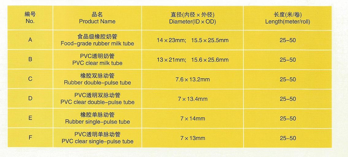 The company offers the following multi-series milk tube and pulse tube for the user selection.