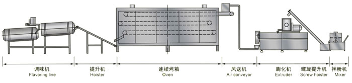 The production line adopts unique equipment configuration and process formula, and the products are of original shapes, unique taste, scientific nutrition proportion, and facilitate the digestion and absorption. The production line is of flexible configuration, convenient operation, and high degree of automation.