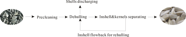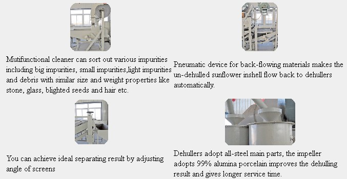 The whole equipment can pre-clean, dehull, remove sunflower shells,separate and reseparate your product at one time, it's the optimum equipment for your sunflower kernels processing industry. It features high persentage of dehulling rate, low persentage of brokens, high automation degree and easy maintenance.