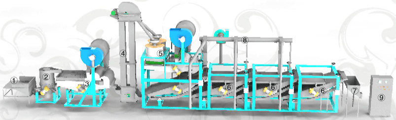 It consists of input hopper ①spiral elevator ②multi-functional cleaner ③bucket elevator ④twin-dehullers ⑤reseparator ⑥(3sets), kernels collector⑦ pneumatic device for back-flowing materials ⑧electric control cabinet ⑨.