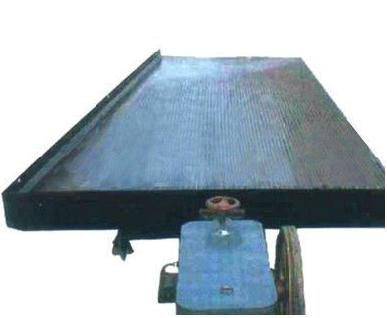 The table is vibrated longitudinally by a mechanism, using a slow forward stroke and a rapid return, which causes the mineral particles to "crawl" along the deck parallel to the direction of motion .The minerals are thus subjected to two forces that due to the table motion and the flowing film of water at right angle to it. The net effect is that the particles move diagonally across the deck from the feed end and, since the effect of the flowing film depends upon the size and density of the particles, they will fan out on the table, the smaller, denser particles riding highest towards the concentrate launder at the far end, while the larger lighter particles are washed into the tailings launder which runs along the length of the table.